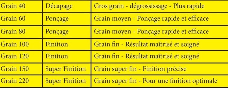| Grain | 100, 120, 220, 40, 60, 80 |