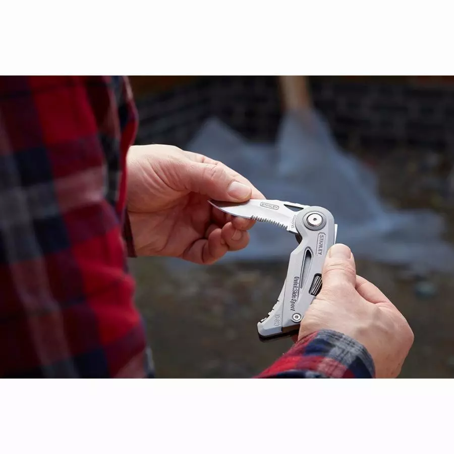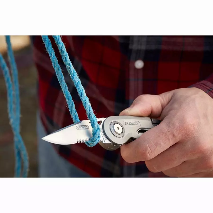 - Une face couteau Quickslide : glissière de lame en zinc, maniement d’une seule main, excellent maintien de la lame pour une sécurité optimale, compatibilité lame trapèze et lame crochet pour plus de polyvalence