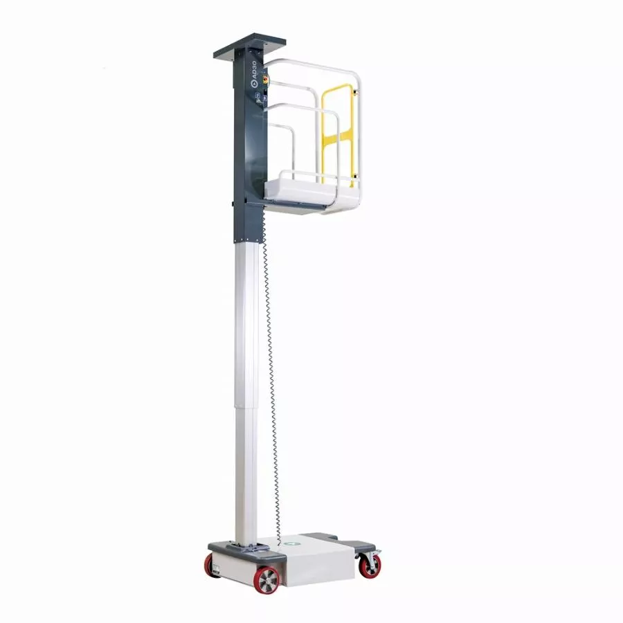 - Compact, polyvalente et équipée d’un mât vertical, cette mini nacelle permet l’élévation de personnes en toute sécurité jusqu’à une hauteur de travail de 4950 mm
