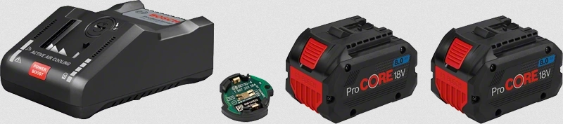- Pack Bosch composé de 2 batteries 18V ProCORe 8.0 Ah et d’un chargeur rapide GAL18V-160C. La ProCORE18V 8.0 Ah Bosch offre environ 90 % d’énergie supplémentaire comparé aux batteries 18 volts classiques. Résultat, le travail est encore plus rapide !
