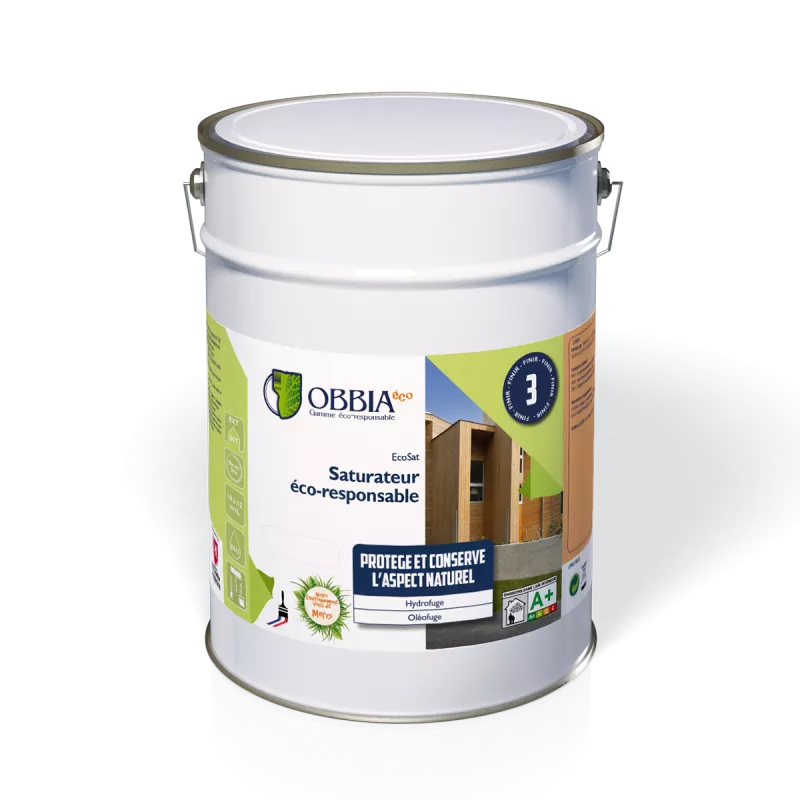 - ECOSAT est un saturateur pour bois en phase aqueuse à base de résines biosourcées. Il assure une protection hydrofuge et oléofuge contre les taches grasses et ralentit l’encrassement des surfaces de bois exposées. ECOSAT donne un aspect mat à satiné, évite le grisaillement et met en valeur le veinage du bois. Prêt à l’emploi, ECOSAT est disponible en incolore, tons bois ou autres teintes à la demande.